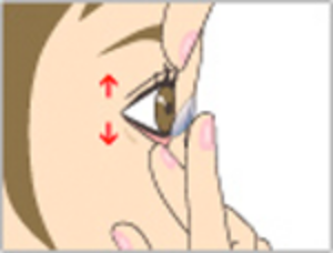 上を見て黒目が上方に向くようにします。鏡を見て、中指で下まぶたを軽く引き下げ、人差し指でレンズを黒目より下にずらします。そのまま、親指と人差し指でレンズを軽くつまんでレンズを外します。(眼にレンズが張り付いていると感じたときは、無理に外さずに、まばたきをしっかり何回かするか、人工涙液を点眼して、張り付きがなくなったことを確認した上でレンズを外して下さい。)