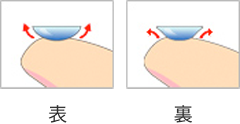 レンズの凹面を上にして、人差し指にのせて真横から見て下さい。このときに光を背景にして、レンズを見るとレンズの形がよくわかります。真横から見たときに、レンズの縁がお椀のように丸くなっていたら、正しくレンズの表が外側になっている状態ですが、レンズの縁が外側に反っていたら、レンズの裏が外側になっていますので、裏返して装用する必要があります。