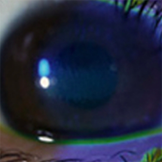 - コンタクトレンズ装用中に眼がゴロゴロとする感じや痛みを感じたら、かかっている可能性があります。早期治療をすれば傷をきれいに治すことができますので、このような症状の時には、すぐ眼科専門医の診断を受けて下さい。初期段階では、自覚症状がないので、定期的に眼科で検査を受けるようにしましょう。(写真は点状表層角膜症:検査用に染色しています)