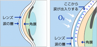 コンタクトレンズを装用した状態の人間の角膜は、コンタクトレンズと角膜のすき間を出入りする涙や空気中から直接酸素を取り入れています。